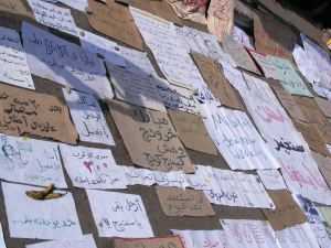 Preuve que cette révolution est d’abord une fantastique prise de parole d’un peuple muselé jusque là par la dictature, quelques personnes ont eu l’initiative de créer ce matin le « Mathaf al-thaura » (Musée de la Révolution) en rassemblant les écrits laissés par les manifestants de la veille : feuilles de papier, cartons griffonnés, mais aussi panneaux illustrés plus élaborés. C’est toute une histoire vivante en train de s’écrire qui se déroule sur une bonne dizaine de mètres. Les gens sont invités à poser leur contribution, ou même à la fabriquer en direct. Ils contemplent ensuite leurs œuvres, et sont comme médusés de se voir prendre la parole (video). Ce musée éphémère ne résistera malheureusement pas à l’augmentation de la densité en milieu de journée. Mais il n’avait peut-être pas vocation à figer les choses dans le marbre car les égyptiens ne vont pas arrêter de s’exprimer, en tout cas c’est tout le mal qu’on leur souhaite.