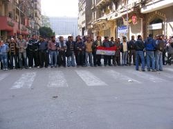 En allant sur la place vers midi, j’aperçois un petit cortège d’une centaine de personnes : on me dit que ce sont les pro-Mubarak, qu’ils ont été payés pour défiler aujourd’hui. Le cordon de sécurité (photo ci-contre) à l’entrée de Talaat Harb a été nettement renforcé par les insurgés qui pressentent de la violence.