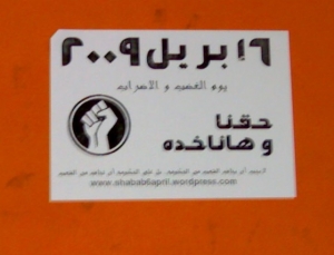 Ce badge avait échappé à l’équipe de nettoyage du métro ce matin : “6 Avril 2009, jour de colère et de grève : C’est notre droit et nous le prendrons” (en égyptien). Signé “Les jeunes du 6 avril”, c’est à dire ceux qui se revendiquent de l’appel à la grève générale du 6 avril 2008, lancé par de jeunes gens sur Facebook (voir post de l’an dernier, et texte de l’appel pour comprendre les motivations). Grève générale qui avait été relayée par de nombreuses organisations ouvrières (notamment à Mahalla) et dont la réussite avait surpris beaucoup de monde ; elle avait été suivie d’arrestations -bien sûr- dont la jeune Isra Abd El Fattah qui a passé quelques mois à la prison pour femmes de Qanater.