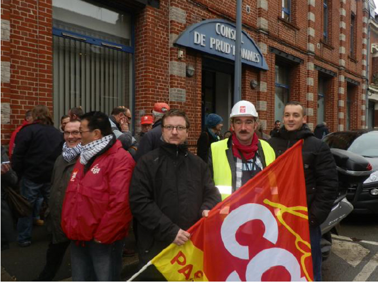 « Un patron lui a reproché d’être un révolutionnaire. Mais n’est-ce-pas le propre d’un militant syndical que d’être révolutionnaire ? » se demande, faussement naïve, Fabienne Comiti. Il est 10h 45 ce mardi 12 décembre quand la chargée de la pédagogie à l’institut Prudis, l’organisme de formation de la CGT, prend la parole au sein du conseil des Prud’hommes envahi pacifiquement mais parfois bruyamment par les militants de la CGT. L’occasion pour Fabienne Comiti de dire tout le bien qu’elle pense de « Christian Delépine que j’ai vu évoluer. C’est un excellent formateur et conseiller prud’hommes qui n’a fait qu’appliquer, ici à Arras, ce qu’on enseigne à Prudis. Evidemment, cela gêne le patronat ». Elle dit aussi son indignation devant les mensonges à répétition proférées par des avocats du barreau d’Arras (André Sipp, Nathalie Poulain) et du MEDEF. Des attaques parfois personnelles mais toujours diffamatoires « dures à vivre. Aussi votre présence lui fait-elle chaud au cœur ». Des 5 Unions locales CGT de l’ouest du Bassin minier, de Liévin, de l’UL de Seclin, de la Fédération CGT de l’agro-alimentaire, de Lille ou du Douaisis, des militants applaudissent à tout rompre sous l’œil soupçonneux de la police politique prête à siffler la milice postée à quelques encablures...