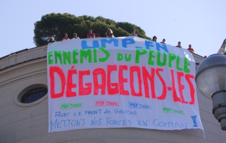 Pour dénoncer ce véritable front anti-social des militants et des élus communistes des Alpes-Maritimes se sont retrouvés, samedi 10 septembre, à la tour Bellanda qui domine le vieux Nice où était déployée une banderole de 100m2 avec comme slogan "UMP-FN, ennenis du peuple, dégageons les !".