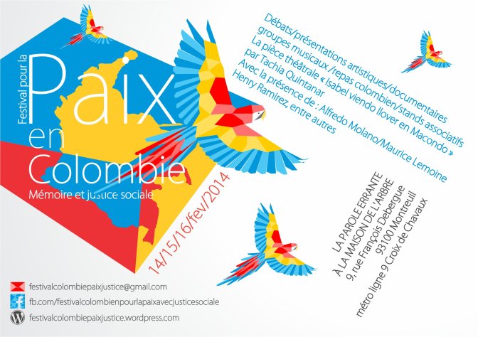 Publie le jeudi 6 février 2014 par Open-PublishingLe Festival pour la paix en Colombie – Mémoire et Justice Sociale est un événement culturel et artistique, espace de débat et d’échange d’idées et d’expériences, né d’une initiative de différents collectifs et personnes qui, à Paris, cherchent à transmettre un message de construction de paix et à manifester leur soutien aux différentes initiatives de construction collective de mémoire et justice sociale qui se déroulent actuellement en Colombie. Ce Festival ne cherche à privilégier aucun courant politique.