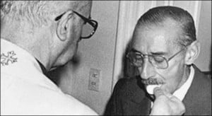 Photo : Prêtre (non-identifié) donnant la communion à Videla. Date inconnue. Source : AFP ?