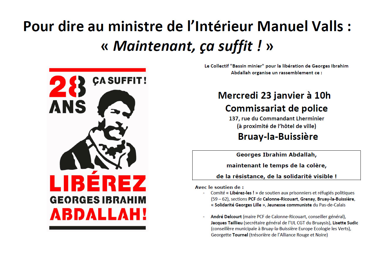 Le Collectif "Bassin minier" pour la libération de Georges Ibrahim Abdallah organise un rassemblement ce : Mercredi 23 janvier à 10h Commissariat de police 137, rue du Commandant Lherminier (à proximité de l’hôtel de ville) Bruay-la-Buissière Georges Ibrahim Abdallah, maintenant le temps de la colère, de la résistance, de la solidarité visible ! Avec le soutien de : - Comité « Libérez-les ! » de soutien aux prisonniers et réfugiés politiques (59 – 62), sections PCF de Calonne-Ricouart, Grenay, Bruay-la-Buissière, « Solidarité Georges Lille », Jeunesse communiste du Pas-de-Calais - André Delcourt (maire PCF de Calonne-Ricouart, conseiller général), Jacques Taillieu (secrétaire général de l’UL CGT du Bruaysis), Lisette Sudic (conseillère municipale à Bruay-la-Buissière Europe Ecologie les Verts), Georgette Tournel (trésorière de l’Alliance Rouge et Noire)