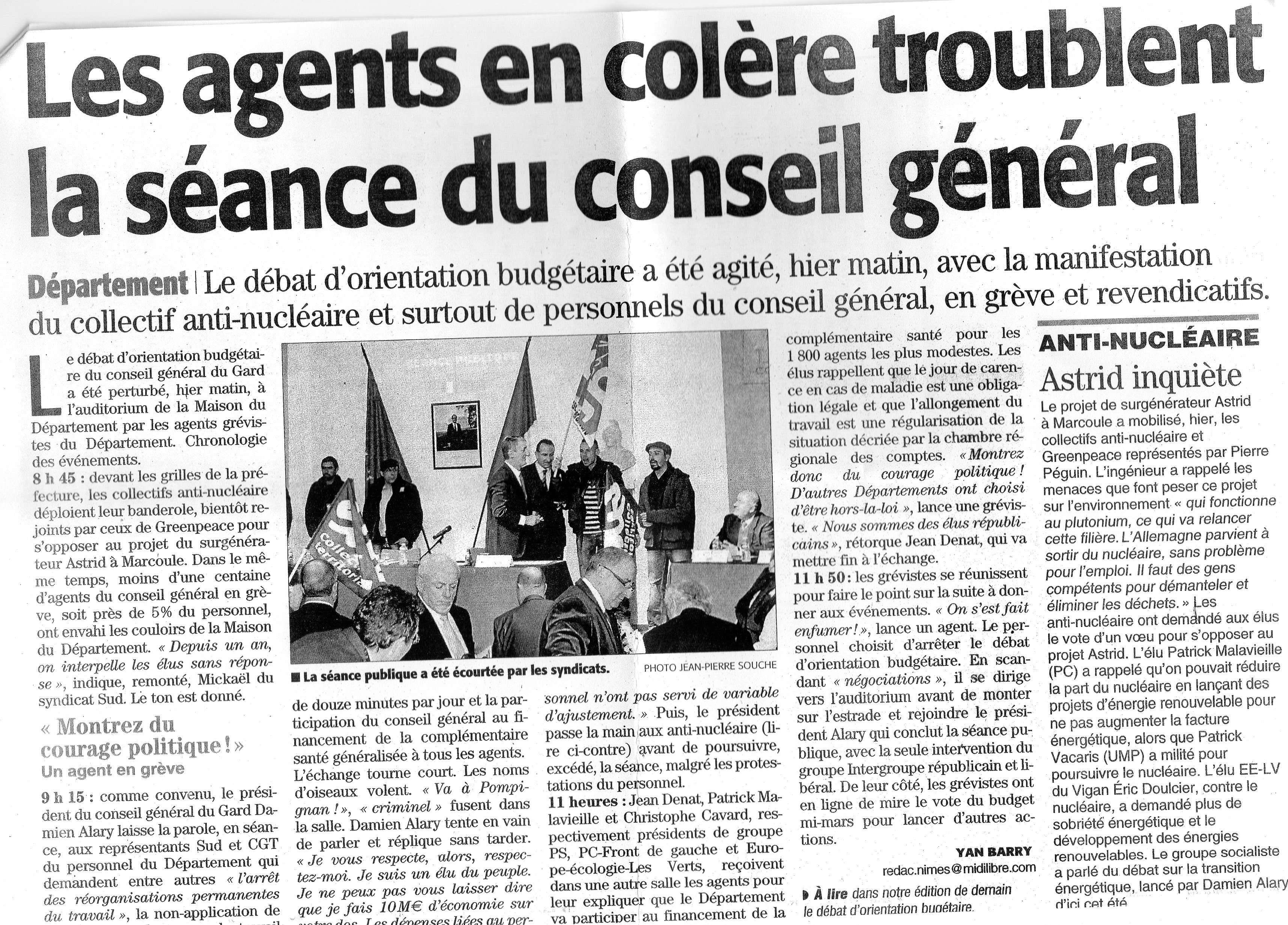 L’ Assemblée départementale du Gard se réunissait le 15 février pour débattre de ses orientations budgétaires. Pendant que les élus se congratulaient mutuellement autour d’un petit-déjeuner-buffet, une bonne centaine de grévistes du Conseil Général, à l’appel de SUD et de la CGT, envahissait l’amphithéâtre où se tenait cette réunion. L’arrivée, quelques minutes plus tard, de quelque 150 militants opposés au projet de surgénérateur Astrid à Marcoule, soutenu par le Conseil Général, faisait monter la pression dans une salle surchauffée...
