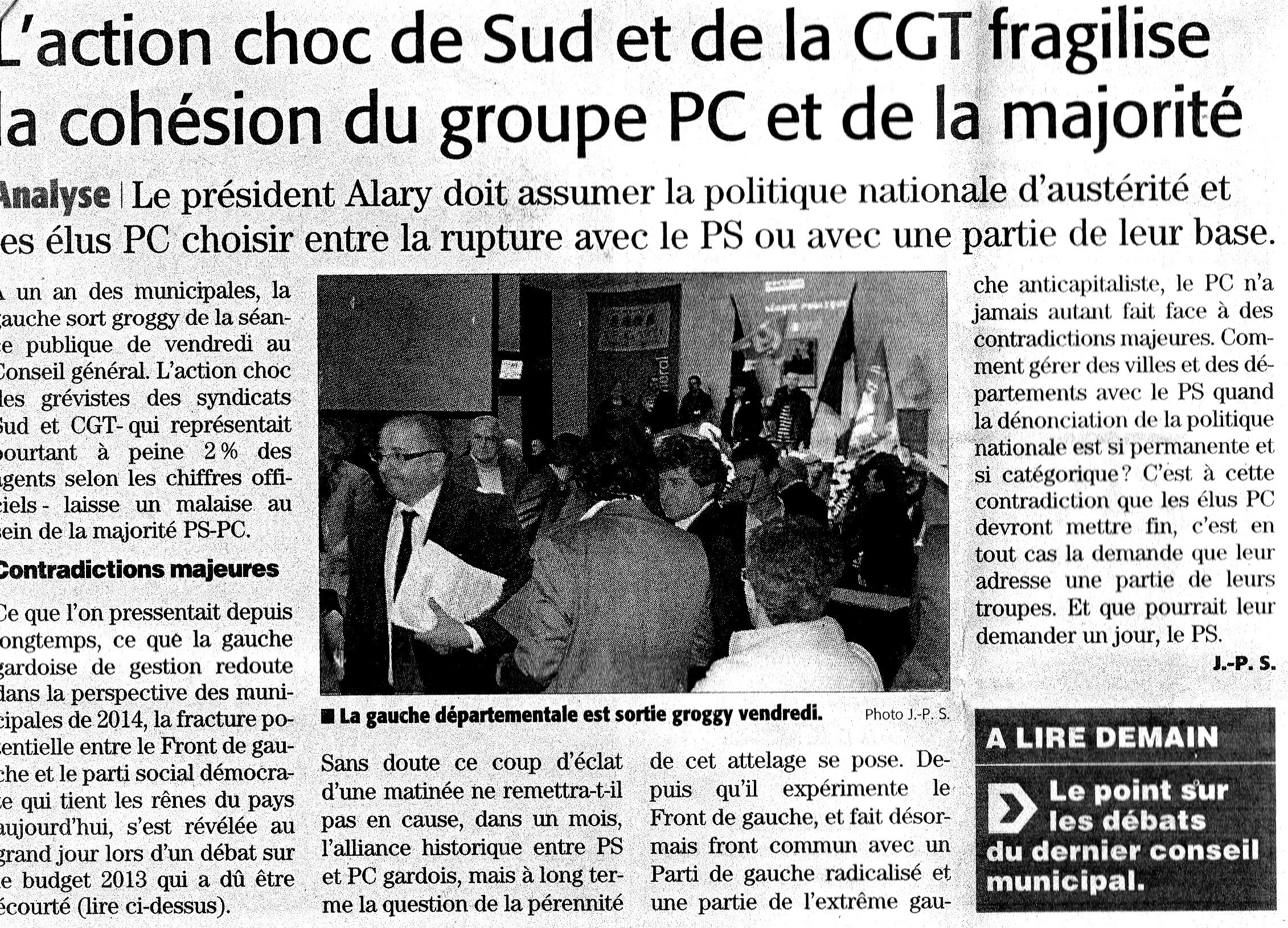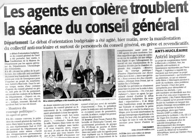 Le titre complet de l’article est "Gard. Une assemblée d’élus coalisés PS, PC et Verts à la peine face à des grévistes et des antinucléaires !"