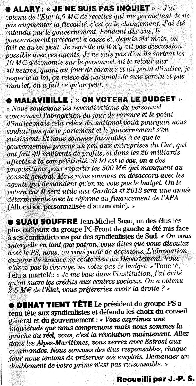 Le face à face entre les grévistes et les représentants du PS, du PC et des Verts est particulièrement tendu. Les élus affichent un front sans faille pour refuser les revendications. Certains militants de la CGT, souvent membres du PC, attaquent durement la politique du Gouvernement, font le lien avec celle du Conseil Général 30 et demandent un changement de cap. Prise de conscience douloureuse de l’écart entre les proclamations nationales du PC-Front de Gauche et la soumission de celui-ci à la gestion néolibérale du PS dans les collectivités territoriales ? Pression pour améliorer leur rapport de forces lors des prochaines élections ? Un peu des deux certainement et dans des proportions variables selon les intervenants...