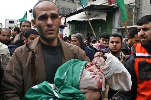 De plus, Israël ne cible pas simplement les édifices du gouvernement et les bâtiments de la sécurité, comme on l’a d’abord pensé. Au vu des derniers reportages, Israël a bombardé le port de Gaza, un campus universitaire, un bâtiment du Comité Olympique, des serres, une école, des maisons, des voitures garées, des mosquées, des prisons (pleines de prisonniers), une cérémonie de remise de diplômes de la police de la circulation, et des entrepôts médicaux. Et les bombardements continuent.