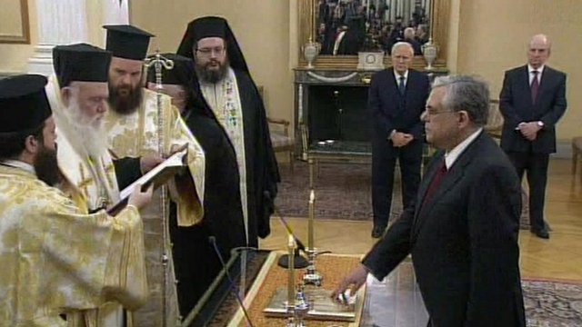 Sur la photo, le nouveau Premier ministre Lucas Papadémos prête serment devant les religieux de l’Eglise orthodoxe.