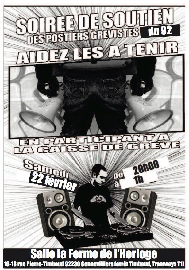 Pour des raisons de disponibilités horaires, la fête de soutien aux postiers grévistes du 92 aura lieu demain à partir de 20h à la salle des GUIGNONS à NANTERRE au 7 bd du Général Leclerc (RER Nanterre Ville)