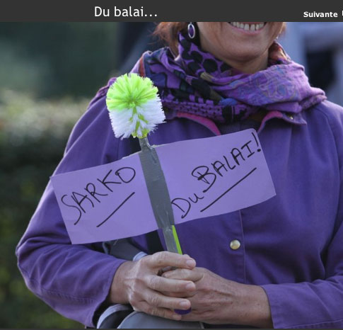 Balai à nos fenêtres, sur nos balcons - balai sur nos voitures dépassant de la vitre d’une portière ou sur la galerie - balai pendu par une corde devant certaines mairies, certaines permanences de députés - balais dans la manif du 6 nov - balai inondant les boites courriels des casseurs sociaux -
