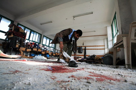 A Gaza un collaborateur palestinien de l’ONU inspecte les décombres après une frappe aérienne israélienne sur une école de l’ONU où des civils avaient trouvé refuge, le 17 janvier 2009 (Wissam Nassar/MaanImages)