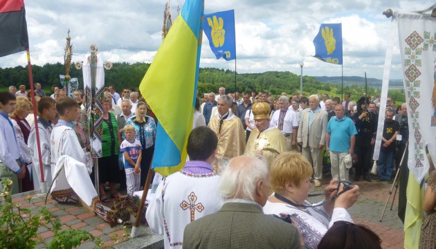 Tout commence par une messe gréco-catholique auprès du monument érigé sur le mont Jbyr, un revers de côte qui domine la plaine, à la mémoire des divisionnistes ukrainiens qui y attendaient de pied ferme l’armée soviétique pour retarder sa progression dans la reconquête de l’Ukraine.