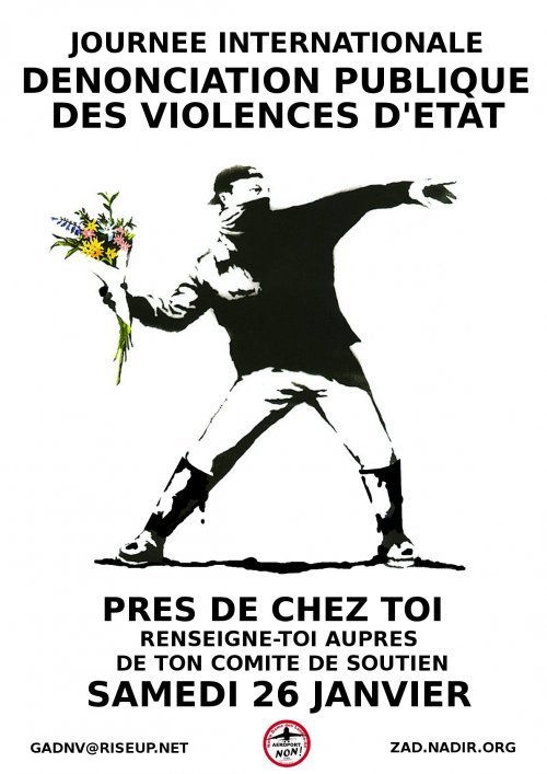 Victimes d’irréparables violences policières (fractures, hémorragies internes, éclats de grenades, surdités, yeux crevés…) plus de 120 blessé(e)s en deux jours lors de la dernière opération policière) et d’une forte répression politique (des centaines de procès et d’arrestations, et deux prisonniers politiques à ce jour), des occupant(e)s de la ZAD - Zone à Défendre contre le projet d’aéroport de Notre-Dame-des-Landes - auxquels s’associe l’ACIPA, lancent une invitation à dénoncer publiquement les violences d’Etat le 26 janvier, dans toutes les villes de France et d’ailleurs.