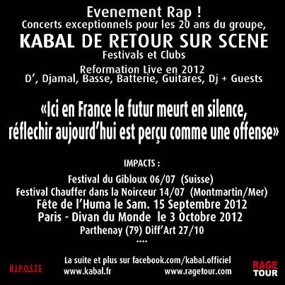 C’est la reformation du groupe qui a marqué le rap français dans sa forme la plus live et la plus politique ! KABAL c’est le maxi « Fou à nier » désormais collector, la maxi produit par Assassin « La conscience s’élève », c’est aussi l’album « Etats d’âmes » autoproduit.