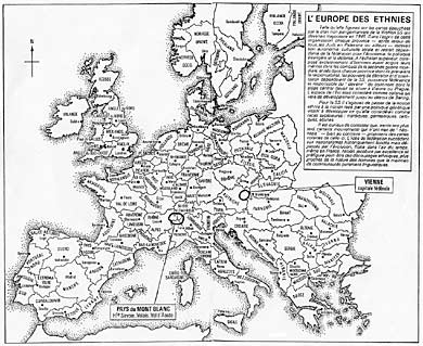 Ce remaniement complet de l’Europe est déjà bien amorcé. En effet, un parti politique européen travaillant en liaison avec les Verts : le Parti Démocratique des Peuples d’Europe - Alliance Libre Européenne (PDPE - ALE) a élaboré en 1997 une carte de l’Union européenne sur des critères ethniques. Réunissant divers mouvements autonomistes et travaillant en liaison directe avec des instituts soutenus par l’Allemagne comme l’UFCE ou encore l’ECMI (European Center for Minorities Issues, siège à Flensburg), ce groupe siégeant au Parlement européen diffuse des concepts qui favorisent l’éclatement des Etats-nations et l’émergence d’une Europe tribale source de conflits infinis. La carte ci-jointe en est une parfaite illustration. D’une certaine manière, nous avons maintenant les éléments généraux qui permettent de nous faire une idée de ce qui nous attend.