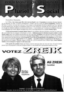 En 2003, voici comment ce personnage se présentait à l’élection législative partielle sous une étiquette "Pluriel et Social" (!) contre Jean-Pierre Brard (soutenu par le PCF et le PS dès le 1er tour).