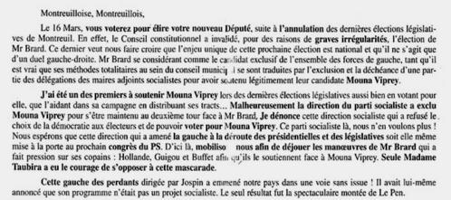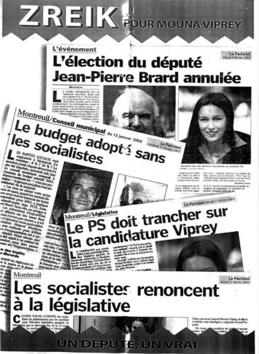 Et le verso, présentant une revue de presse du Parisien sur la crise du 2ème tour en juin 2002 avec le maintien de Mouna Viprey au 2ème tour de la législative, arrivée derrière Jean-Pierre Brard. Le titre de ce verso : "Zreik pour Mouna Viprey".