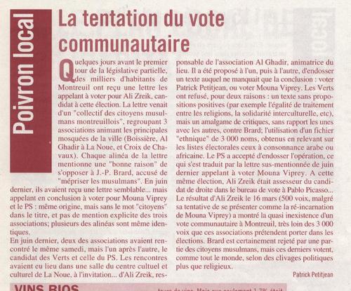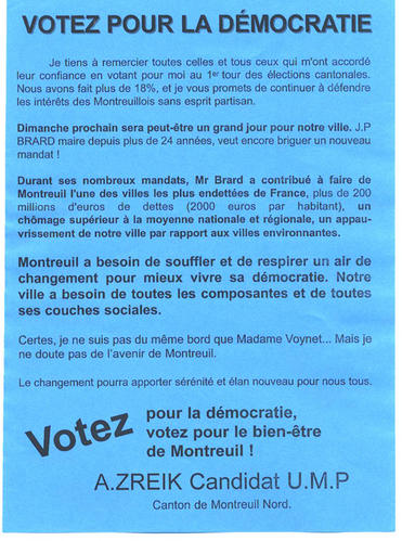 Pour mémoire, Ali Zreik - candidat UMP dimanche dernier - est ce personnage obscur dont parlait Partrick Petitjean lui même dans le journal des Verts montreuillois le Poivron n°50 en 2003, déjà cité dans ma précédente note.