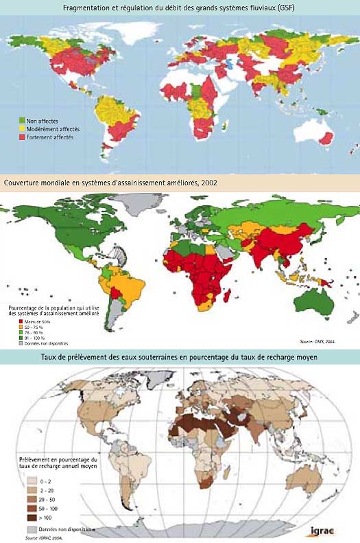 Or, la pression sur la ressource en eau ne cesse de grandir. Les premiers fournisseurs d’eau dans le monde (fleuves, rivières, bassins) s’assèchent (2). Des taux élevés d’exploitation, supérieurs à 50 % de la recharge, sont déjà constatés dans plusieurs pays (cf. carte). Par ailleurs, le réchauffement climatique, avec la fonte des glaciers et des neiges ’éternelles’, contribue à la chute de réserves historiques importantes, quand dans le même temps l’agriculture accroît encore ses prélèvements d’eau (plus de 90 % de l’eau prélevée dans le monde, l’est à des fins agricoles).