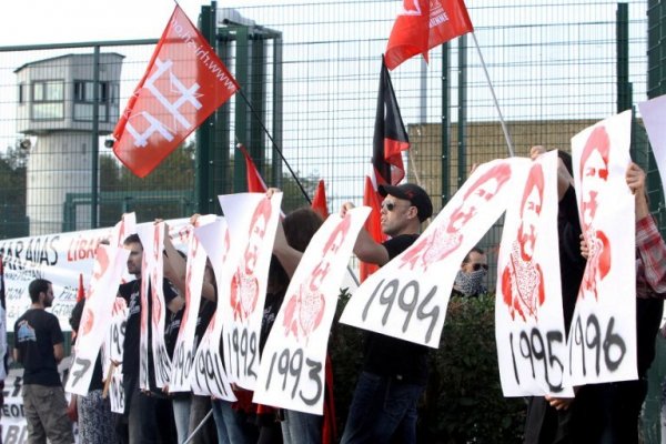 FRANCE, Lannemezan : Des manifestants aux abords de la prison de Lannemezan, ce 26 octobre 2013, réclamant la libération de Georges Ibrahim Abdallah, emprisonné depuis 30 ans. LAURENT DARD / AFP