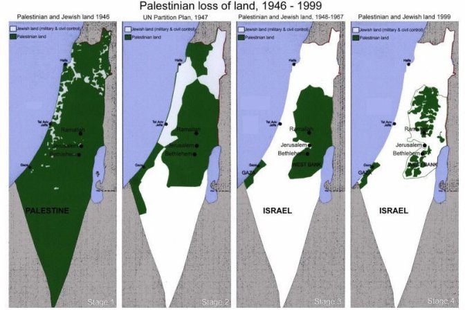 4 cartes racontant l’histoire d’un nettoyage ethnique, le vol des terres palistiniennes de 1947 à 1999.