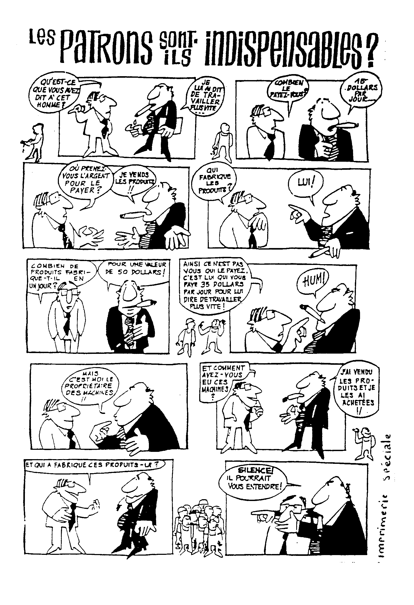 Mais, alors qu’un ou deux mois avant mai 68 l’on nous disait qu’il était absolument impossible d’augmenter les ouvriers de 2 ou 3% (d’où sortirait-on l’argent ?), en mai 68 le SMIG fut augmenté de 33%. Pourtant, même après cela, les richesses n’ont pas semblées guère mieux réparties qu’auparavant : les riches n’ont pas semblés moins riches. Leur richesse était donc infiniment plus grande que l’équivalent de ces misérables 33% d’augmentation.