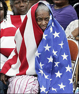 Le peu de chose qui reste aux « sans-abri de Katrina » à part les habits sales qu’ils portent, tient dans des sacs en plastique ou des chariots défoncés. Des femmes tentent de protéger leurs bébés de la saleté. Beaucoup de réfugiés sont pieds nus et laissent traîner leurs regards hagards et fatigués pour se frayer un chemin entre les tas d’ordures.