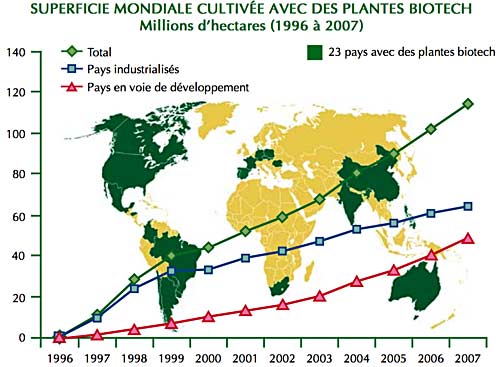 Les organismes génétiquement modifiés (OGM) continuent de gagner du terrain sur les cultures conventionnelles. Douze ans après le début de leur commercialisation, les OGM ont été cultivés sur 114,3 millions d’hectares en 2007, soit une hausse de 12 % (12,3 millions d’hectares) par rapport à l’année précédente. Cette nouvelle croissance de la surface agricole en OGM s’est faite en bonne partie grâce aux 2 millions d’agriculteurs qui ont cultivé pour la première fois des plantes transgéniques, portant le nombre d’utilisateurs à 12 millions à travers le monde.