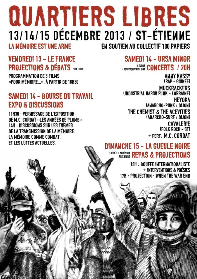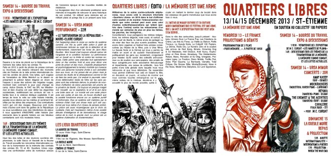 Du 13 au 15 décembre, quartiers libres pour la mémoire des luttes à Saint-Etienne. Projections de films, débats, rencontres, concerts, expositions, performances... pour ne pas oublier et pour tracer un autre futur.