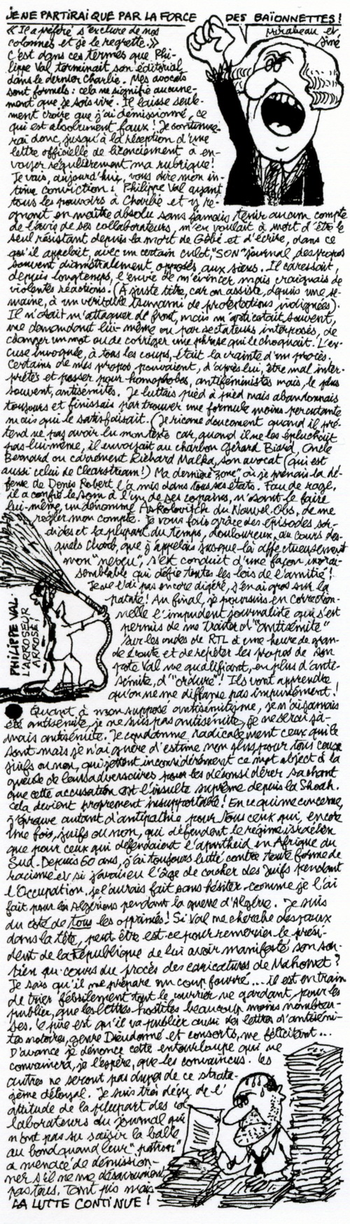 "Il a préféré s’exclure de nos colonnes et je le regrette." C’est dans ces termes que Philippe Val terminait son éditorial dans le dernier Charlie. Mes avocats sont formels : cela ne signifie aucunement que je sois viré. Il laisse seulement croire que j’ai démissionné, ce qui est absolument faux. Je continuerai donc, jusqu’à la réception d’une lettre officielle de licenciement à envoyer régulièrement ma rubrique ! Je vais, aujourd’hui, vous dire mon intime conviction : Philippe Val ayant tous les pouvoirs à Charlie et régnant en maître absolu sans jamais tenir aucun compte de l’avis de ses collaborateurs, m’en voulait à mort d ‘être le seul résistant depuis la mort de Gébé et d’écrire, dans ce qu’il appelait, avec un certain culot, "SON" journal, des propos souvent diamétralement opposés aux siens.