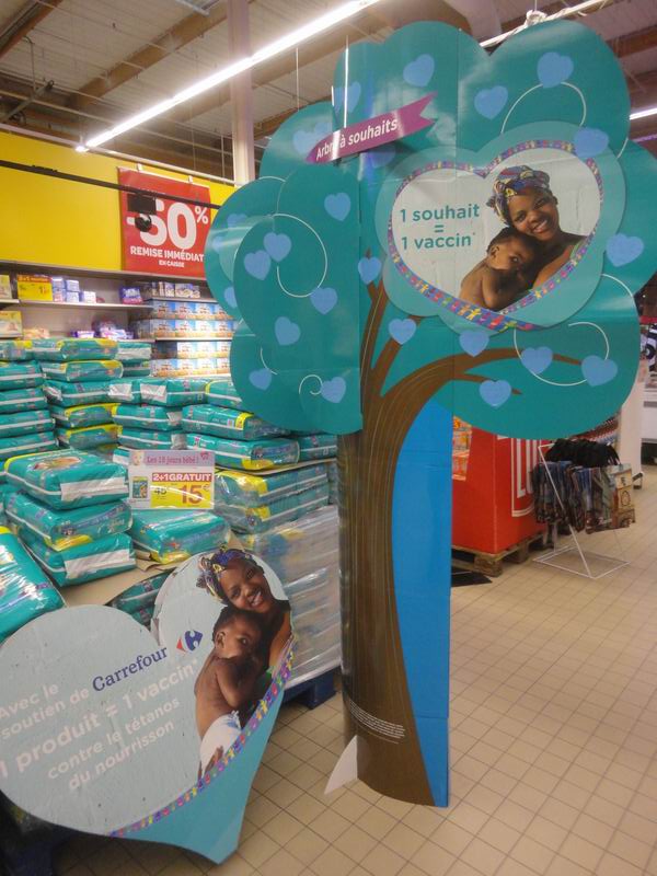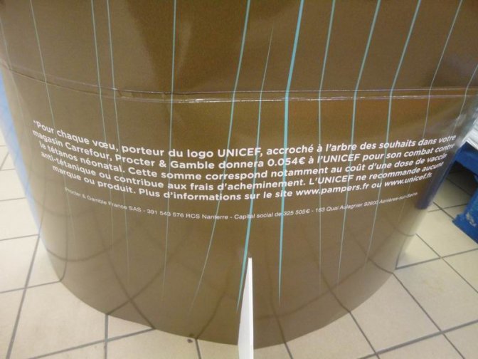 Publie le samedi 9 novembre 2013 par Open-PublishingP and G via sa marque Pampers, propose avec Carrefour et l’UNICEF, une oeuvre humanitaire : via un "arbre à dons" (support commercial sur lequel les consommateurs collent des preuves d’achat). Pour tout achat, PG reverse 0,054 euro pour l’achat de vaccins contre le tétanos du nourrisson.