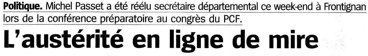 De l’extrait de l’entrevue récente de Michel Passet que nous reproduisons ici nous retiendrons le maintien de l’habituelle rhétorique contre l’austérité qui fait l’impasse sur la nécessité que celle-ci soit assise sur une opposition au cours politique du Parti Socialiste, que ce soit nationalement ou localement. La référence convenue au rassemblement à gauche pour une autre politique doit, par là-même, être décodée comme le maintien du cap, dans le Front de gauche, d’une démarche visant à infléchir à gauche le Parti Socialiste pour faire barrage à la droite aux prochaines municipales. Démarche dont chacun peut voir en région, dans le conseil général ou dans les municipalités et autres intercommunalités, qu’elle est synonyme d’alignement et de soumission au social libéralisme sur l’eau, ainsi que nous le venons de le voir, comme sur le soutien aux entreprises, à l’école privée, aux délégations de service public, à l’Hinterland, à la LGV, etc.) !