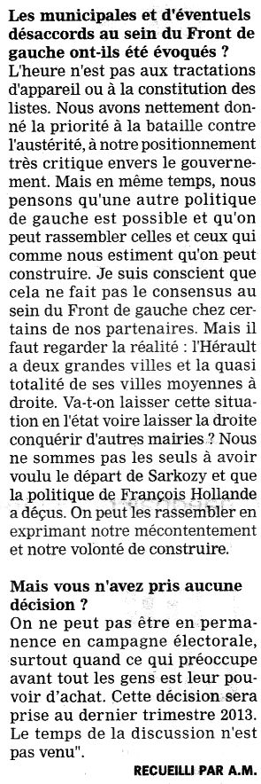 (1) La reconduction toute récente de Michel Passet à la tête du PCF 34 (voir ci-dessous) doit être interprétée comme un aval accordé à l’artisan "historique" de l’alliance de ce parti avec le PS dans le département et, concomitamment, à celui qui a imposé à ses partenaires du Front de gauche de rompre l’unité réalisée en 2010 avec le NPA. Voilà qui peut être lu comme une fin de non-recevoir à la critique adressée "à la majorité PS-société civile-PCF-Modem" de Montpellier par GA 34, une dizaine de jours auparavant, lors de sa conférence de presse. Critique que GA 34 s’était enfin décidée à exprimer publiquement sans que, comme l’ont confirmé les Assises régionales sur l’écosocialisme, elle parvienne pour autant à l’inscrire au coeur de la définition programmatique dudit écosocialisme sous l’éclairage de questions aussi essentielles qu’Aqua Domitia ou la campagne pour la régie publique de l’eau.