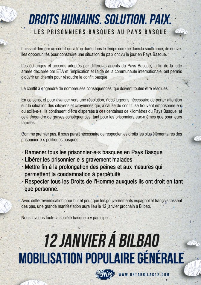 Droits de l’Homme. Solution. Paix. Prisonniers basques au Pays Basque. Le 12 Janvier, tous à Bilbao !