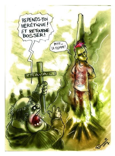 Une autre gueule d’empeigne, nous nommons ici Hortefeux – l’ex-ministre des expulsions – se rendra compte sous peu que faire face à des millions d’hommes et de femmes qui ne veulent pas être sacrifiés sur l’autel du capital est un exercice autrement périlleux qu’ajuster des coups de tonfa sur le crâne des sans-papiers en vue de les expulser. Ces tristes sires regretteront bientôt que des généticiens dévoyés n’aient pas réussi à cloner à grande échelle François Chérèque le jaune, car si tel avait été le cas, patrons et gouvernements battraient des mains, ravis qu’ils seraient de voir leurs chimères apposer signature au bas de tous les accords torchons qu’ils leur tendraient.