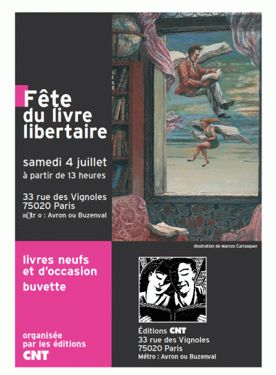À partir de 13 heures : Fête du livre libertaire, organisée par les éditions de la CNT. Livres neufs et d’occasion (t’y crois à ça, toi ?). Buvette. 33, rue des Vignoles. Métro Avron ou Buzenval.