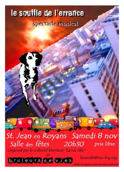 18h30, Salle de fêtes. Apérorencontre autour des expositions politiques et artistiques. 20H30 Le souffle de l’errance spectacle musical par la compagnie Les brûleurs de vies en soutien à la librairie l’Autodidacte. Dans le cadre des rencontres libertaires « Et pourtant ils existent », organisées par le groupe La Rue Râle de la Fédération anarchiste. Contact : laruerale(a)no-log.org
