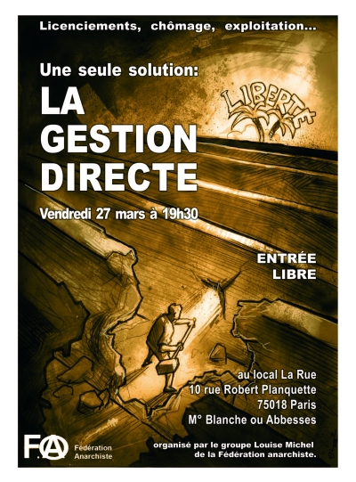 19h30. Conférence-débat « Gestion directe » avec René Berthier et Thierry Porré, organisée par le groupe libertaire Louise-Michel de la Fédération anarchiste au local La Rue, 10, rue Robert Planquette, M° Blanche et Abbesses.