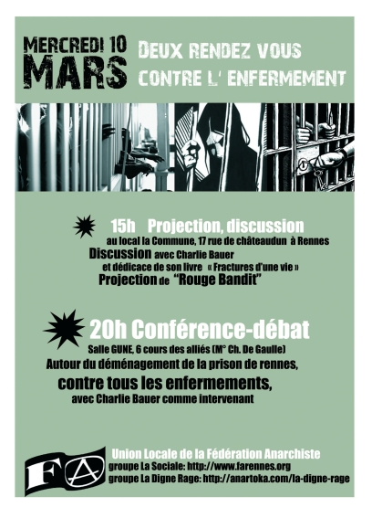 15 heures. Projection du nouveau DVD de Charlie Bauer Rouge bandit. Discussion-dédicace sur son livre Fractures d’une vie autour d’un pot convivial. Local la Commune, 17, rue de Châteaudun. 20 heures. Autour du déménagement de la prison de Rennes, le groupe la Sociale organise, avec Charlie Bauer comme intervenant, une réunion publique contre tous les enfermements. Maison du Champ-de-Mars, salle Gune, 6, cours des alliés. M° Charles-de-Gaulle.