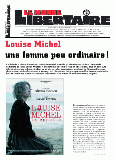 Le Monde libertaire # 1588 comprend un supplément spécial de 8 pages consacré à la sortie au cinéma du Film « Louise Michel, la rebelle » de Solveig Anspach