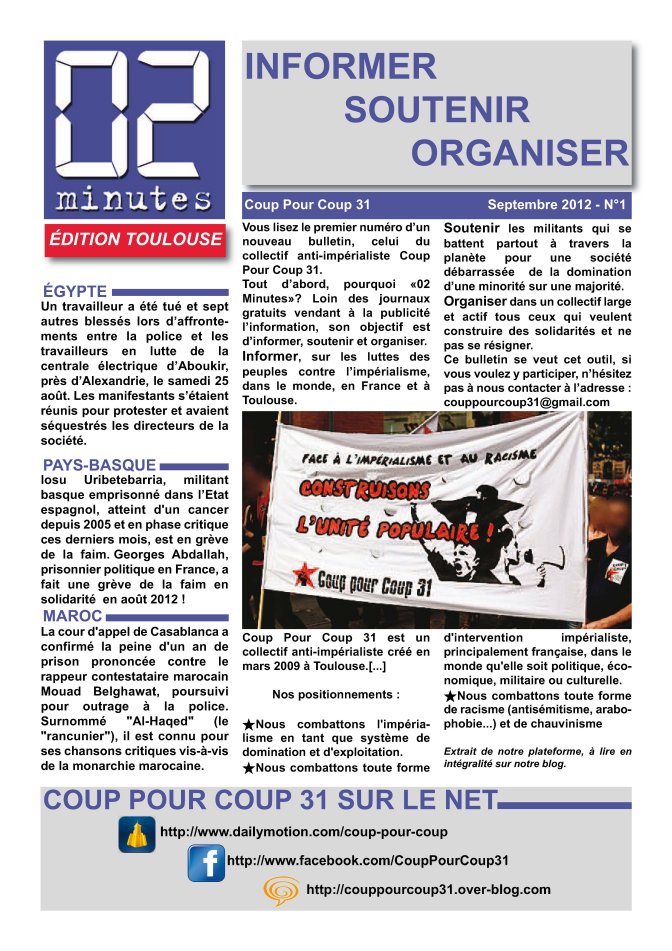 Vous lisez le premier numéro d’un nouveau bulletin, celui du collectif anti-impérialiste Coup Pour Coup 31. Tout d’abord, pourquoi « 02 Minutes » ? Loin des journaux gratuits vendant à la publicité l’information, son objectif est d’informer, soutenir et organiser.
