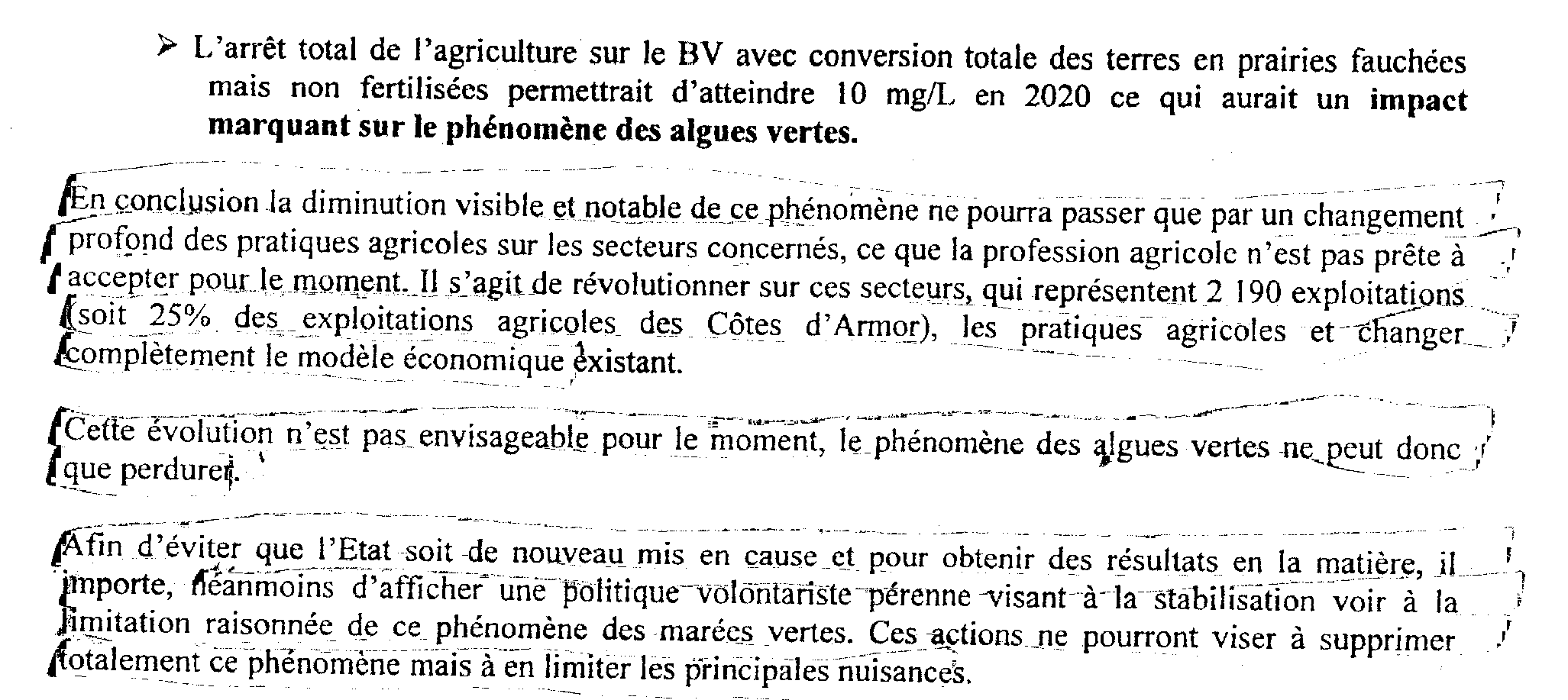 Le représentant de l’État fait plus loin état des actions déjà engagées pour enrayer le phénomène. Mais fait montre d’un certain scepticisme. « La mise en œuvre de ces mesures a permis, au mieux, de stabiliser les taux de nitrates présents dans les rivières, sans obtenir un résultat visible de diminution du phénomène des marées vertes. » Et d’entrevoir une solution radicale : « L’arrêt total de l’agriculture sur le bassin-versant avec conversion totale des terres en prairies fauchées mais non fertilisées permettrait d’atteindre 10 mg/l (de nitrate) en 2020, ce qui aurait un impact marquant sur le phénomène des algues vertes ».