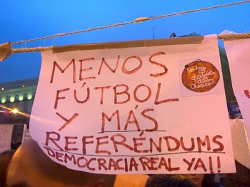 L’autre caractéristique du mouvement est l’hétérogénéité des causes qu’il réussit à regrouper. Pendant les derniers jours les autorités se sont trouvées surprises par le nombre infini de demandes d’autorisation pour manifester déposés par plus de 500 différentes associations. Depuis les écologistes aux groupes contraires à la dite « Loi Sinde » [Hadopi] qui limite les chargements de contenus protégés par les droits d’auteur sur Internet. Il y a des associations de consommateurs, de gens touchés par la crise immobilière et qui ont du rendre leur logement aux banques parce qu’ils n’ont pas pu continuer à payer l’hypothèque, il y a des défenseurs des droits des animaux et jusqu’au mouvement « Despacito » qui propose, la vie lente, comme alternative à la folie du monde moderne. Hier sur plusieurs places des discussions se sont tenues sur l’opportunité d’une « décroissance », théorie économique qui a grandi en France et qui se présente comme l’alternative au néolibéralisme dominant dans cette Europe contemporaine.