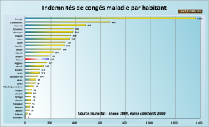 La vérité est qu’en France, les congés maladie coûtent étonnamment peu à la protection sociale. Pas plus de 185 euros par habitant ont été versés à ce titre en 2009, tous régimes confondus (en euros constants 2000).