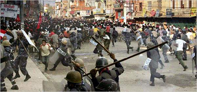Trois personnes au moins ont été tuées et des dizaines d’autres blessées par balles. Douze sont dans un état critique. Selon les témoins, la répression a été violente contre la marée humaine qui a déferlé dès l’aube vers la capitale du Népal venant des villages voisins aux cris de "À bas Gyanendra, vive la démocratie".