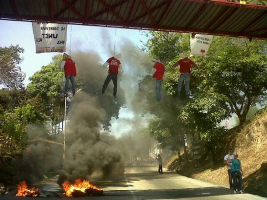 Lorsque les premières violences ont éclaté dans l’état de Tachira (épicentre de la contrebande d’aliments et de carburant vers la Colombie), le style des paramilitaires uribistes était reconnaissable dans cette campagne de pendaisons publiques de mannequins représentant des militants bolivariens.