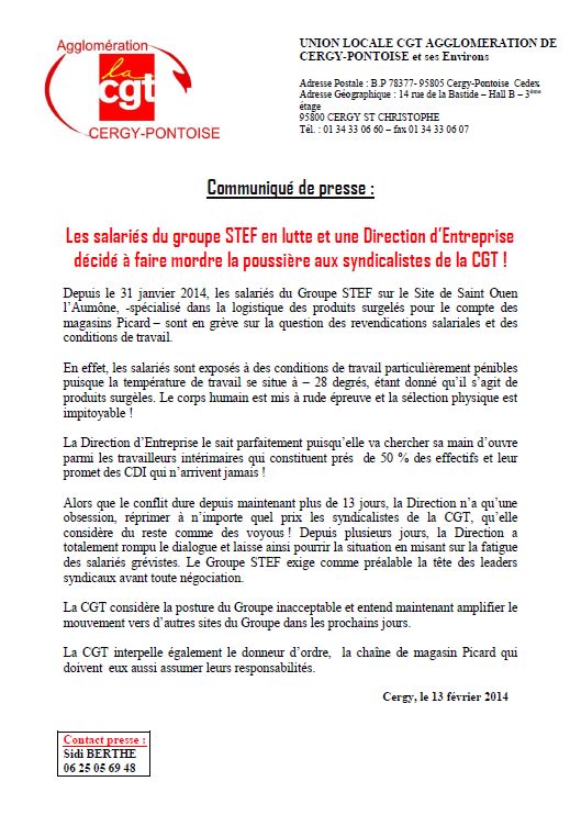 Depuis le 31 janvier 2014, les salariés du Groupe STEF sur le Site de Saint Ouen l’Aumône, -spécialisé dans la logistique des produits surgelés pour le compte des magasins Picard – sont en grève sur la question des revendications salariales et des conditions de travail.