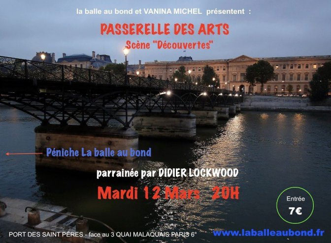 Parmi les lieux de résistance chanson - entendons par là des salles où l’artiste est programmé sans avoir à payer la salle, la pub, les musiciens, la Sacem...- il y a au Vingtième Théâtre, les Lundis de la chanson, soirées avec une première partie choisie en harmonie avec l’invité principal, ou des co-plateaux, ou des spectacles comme les Nuits de la pleine lune, avec multi invités. Il y a aussi « La passerelle des arts » un rendez-vous mensuel, le deuxième mardi, sur une péniche, La balle au bond, avec une scène « découvertes » et ouverte. Le 4 ème rendez-vous le 12 mars sera parrainé par Didier Lockwood, et l’esprit de ces soirées est dans la ligne d’un des maîtres et partenaires de Vanina Michel, l’initiatrice de cette passerelle, « Ne pas faire demain ce qu’on a fait aujourd’hui, qui était différent de ce qu’on a fait hier. » Stricto sensu c’est le spectacle vivant. Selon l’évangile de Lubat, et les homélies de Prévert, dont Vanina Michel est une des interprètes maîtrisant le mieux les dits de maître Jacques.