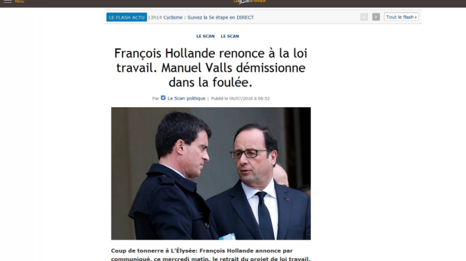 Publie le mercredi 6 juillet 2016 par Radio Campus Lille - Open-Publishingl y avait le Gorafi, voici le www-lefigaro.com : ce mercredi matin, ce site copiant assez bien celui du Figaro annonçait que François Hollande renonçait à la loi travail et que Manuel Valls démissionnait dans la foulée.